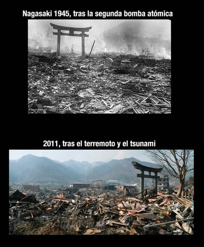 A primeira fotografia é depois da bomba atómica em Nagasaki. A segunda fotografia é depois dos terramotos e do Tsunami!